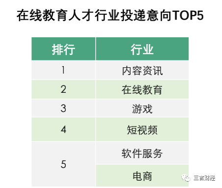 招聘网站数据还显示,在线教育行业的人才求职意向中,内容资讯最受欢迎,其次是在线教育、游戏、短视频、软件服务、电商。