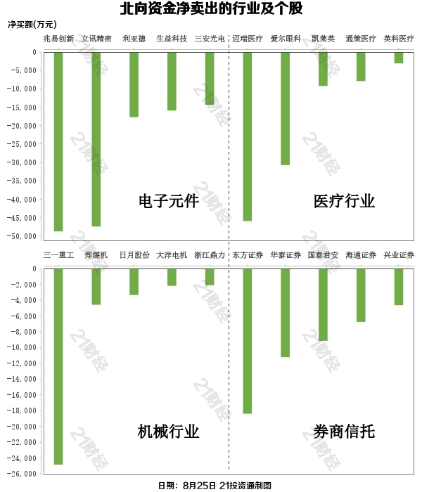 北向资金减持了23个行业,其中电子元件最多,净卖出金额达11.93亿元,其次是医疗行业,净卖出6.18亿元。