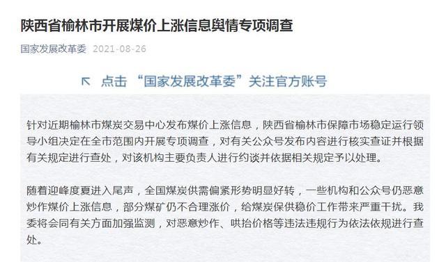 针对近期榆林市煤炭交易中心发布煤价上涨信息,陕西省榆林市保障市场稳定运行领导小组决定在全市范围内开展专项调查,对有关公众号发布内容进行核实查证并根据有关规定进行查处,对该机构主要负责人进行约谈并依据相关规定予以处理。