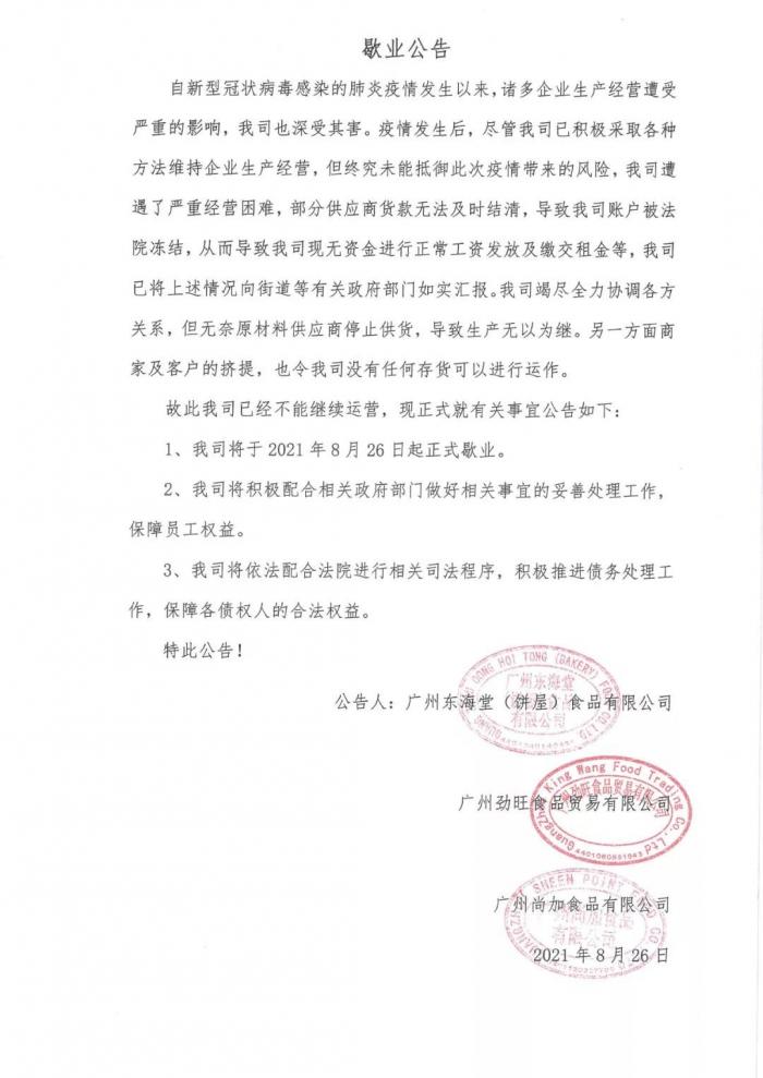据广州东海堂(饼屋)食品有限公司公告,自新冠肺炎疫情发生以来,东海堂尽管已积极采取各种方法维持企业生产经营,但终究未能抵御此次疫情带来的风险,遭遇了严重经营困难。