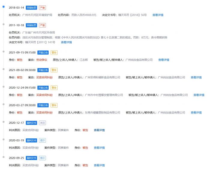 据启信宝信息,落款处的另外两家公司(广州尚加食品有限公司、广州劲旺食品贸易有限公司)分别为东海堂的加工厂和批发公司,目前公司法定代表人均为胡振强。其中,广州尚加食品显示有多起司法诉讼。截至8月27日,该公司企业风险信息达9条,包括环保处罚、开庭公告、判决文书等,在今年的开庭公告中,一条是买卖合同纠纷,另一条则是劳动争议,开庭时间均在9月。