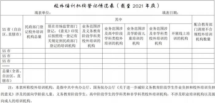 通知要求,各地民政部门要抓紧建立校外培训机构登记工作台账,及时上报发现的新情况新问题,于2021年12月31日前,向民政部社会组织管理局报送《校外培训机构登记情况表(截至2021年底)》。