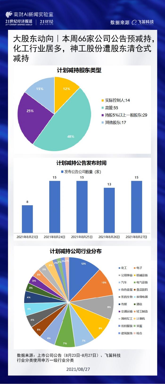 8月23-8月27日期间,共有66家上市公司披露了计划减持的公告,化工行业居多,达到9家。