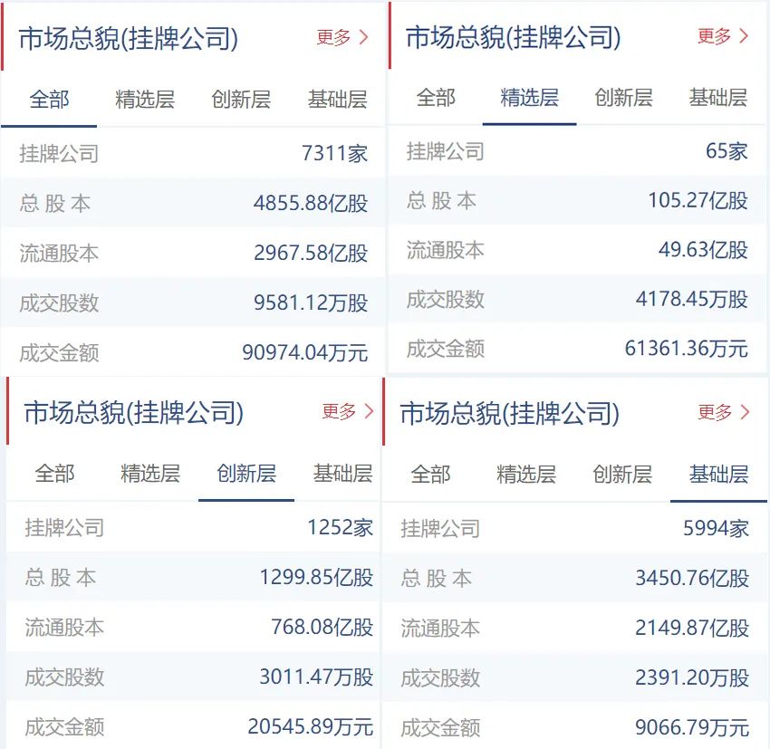 新三板挂牌公司总计7311家(精选层65家,创新层1252家,基础层5994家),总股本4855.88亿股,流通股本2967.58亿股。