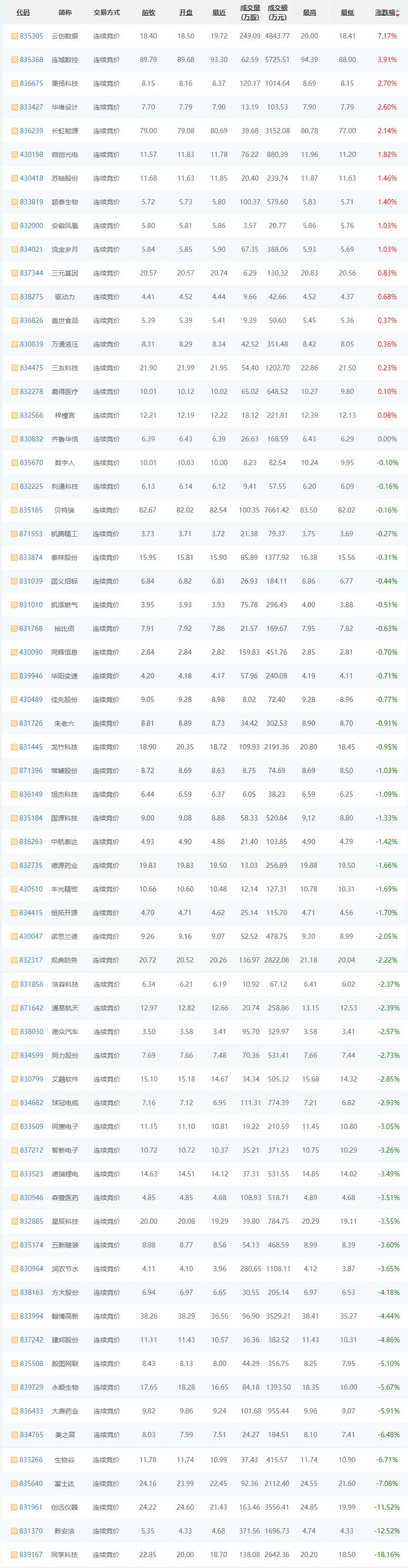 截至8月27日收盘,今日成交金额为9.10亿元,精选层成交金额为6.14亿元,创新层成交金额为2.05亿元,基础层成交金额为0.91亿元;今日成交股数为9581.12万股,精选层成交股数为4178.45万股,创新层成交股数为3011.47万股,基础层成交股数为2391.20万股。
