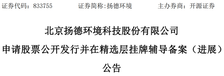 扬德环境于 2021年8月20日向北京证监局提交了向不特定合格投资者公开发行股票并在精选层挂牌的辅导备案材料,辅导机构为开源证券。2021年8月26日,北京证监局下发了《关于对北京扬德环境科技股份有限公司公开发行股票辅导登记的受理函》。