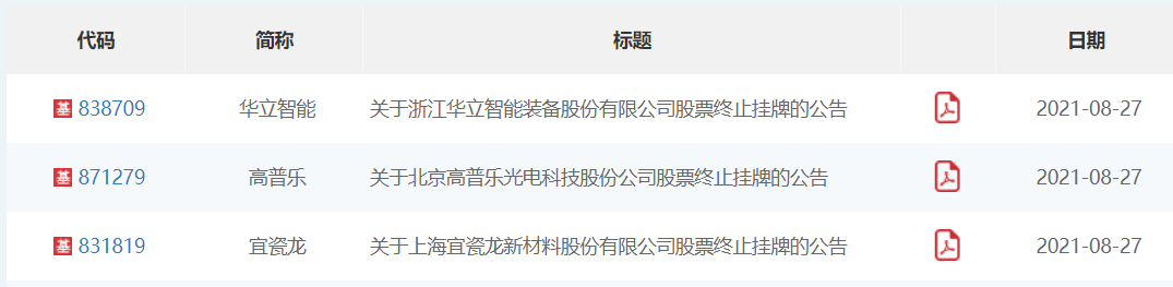 8月27日,新三板基础层公司华立智能(838709)、高普乐(871279)、宜瓷龙(831819)终止挂牌。