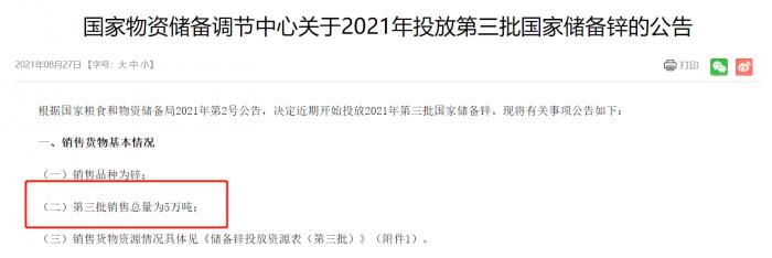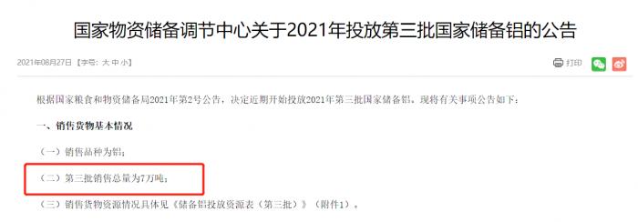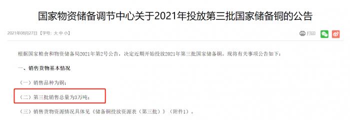 8月27日,国家物资储备调节中心公告,将投放第三批3万吨国家储备铜、7万吨国家储备铝、5万吨国家储备锌。公开竞价时间为9月1日。