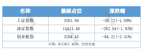 8月26日,A股三大指数集体走弱,周期股走强,小金属概念上演涨停潮,大消费板块集体调整。两市成交额达到1.37万亿元,与前一日相比有所增加。