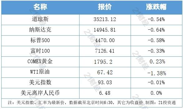 美东时间周四,美国三大股指全线收跌,纳指和标普500指数结束5连涨。科技股多数走低,苹果跌0.55%,特斯拉跌超1%。中概股多数下跌,逸仙电商跌17.72%。