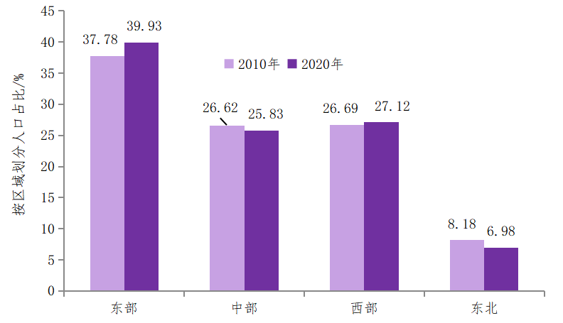 当前,我国人口已经呈现出向东南部地区集聚的趋势。按区域划分,东部地区人口总数56372万人,占比39.93%;中部地区人口总数36469万人,占比25.83%;西部地区人口总数38285万人,占比27.12%;东北地区人口总数9851万人,占比6.98%。与2010年第六次全国人口普查数据相比,东部地区人口比重上升2.15个百分点,中部地区人口比重下降0.79个百分点,西部地区人口比重上升0.22个百分点,东北地区人口比重下降1.20个百分点。人口流动具有明显的区域化特征,经济发达的沿海地区省份常住人口增加,而经济欠发达的内陆地区省份常住人口呈净流出态势。