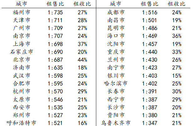 表1:国内主要城市房屋租售比及租金收入比