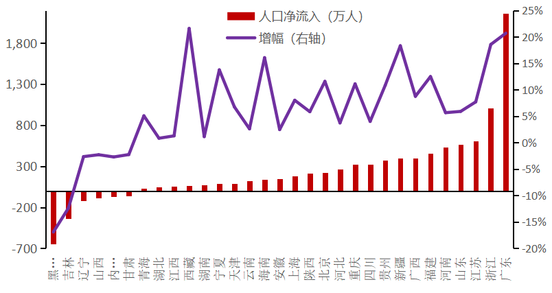 人均可支配收入是居民最主要的“收入”项。从收入的角度而言,不同省份间人均可支配收入的差距是促使人口迁徙的重要动力源。研究表明,迁入地收入水平等经济因素对劳动力的吸引作用显著,经济发达地区凭借其较高的人均可支配收入吸引了外来流动人口。从人口流动的实际数据中可以观察到,广东省人均可支配收入较高,位于全国前五,同时也是流入人口最多的省份;而另一方面,东北三省人均可支配收入增幅较缓,在全国范围内排名靠后,因此也是2010-2020年人口流出数量最多的前三个省份。