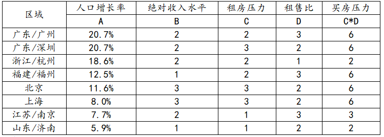 数据说明:绝对收入水平分值越高代表收入水平越高;相对租房压力是租30平米占全年收入的比例,分值越高代表租房支出占比越高;买房压力与相租房压力一致。