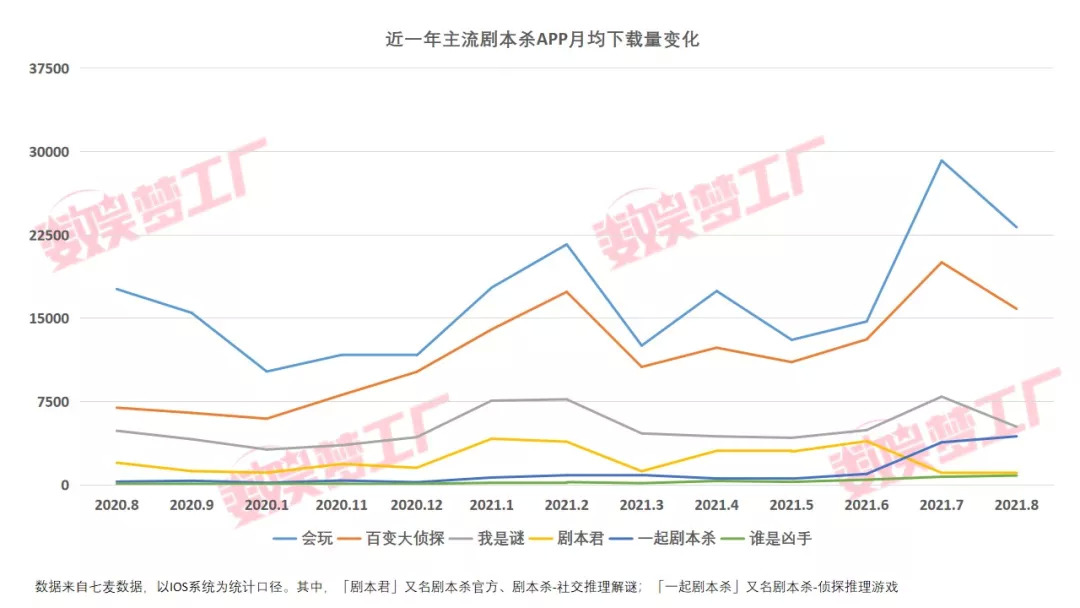 但疫情以来,玩家增长出现了积极信号。数娱君统计后发现,最近12个月,受疫情宅家影响,剧本杀的玩家活跃度阶段性攀升,头部剧本杀App下载量总体走高。尤其是今年7月,暑期放假和疫情影响叠加,几大剧本杀App的下载量显著上涨。