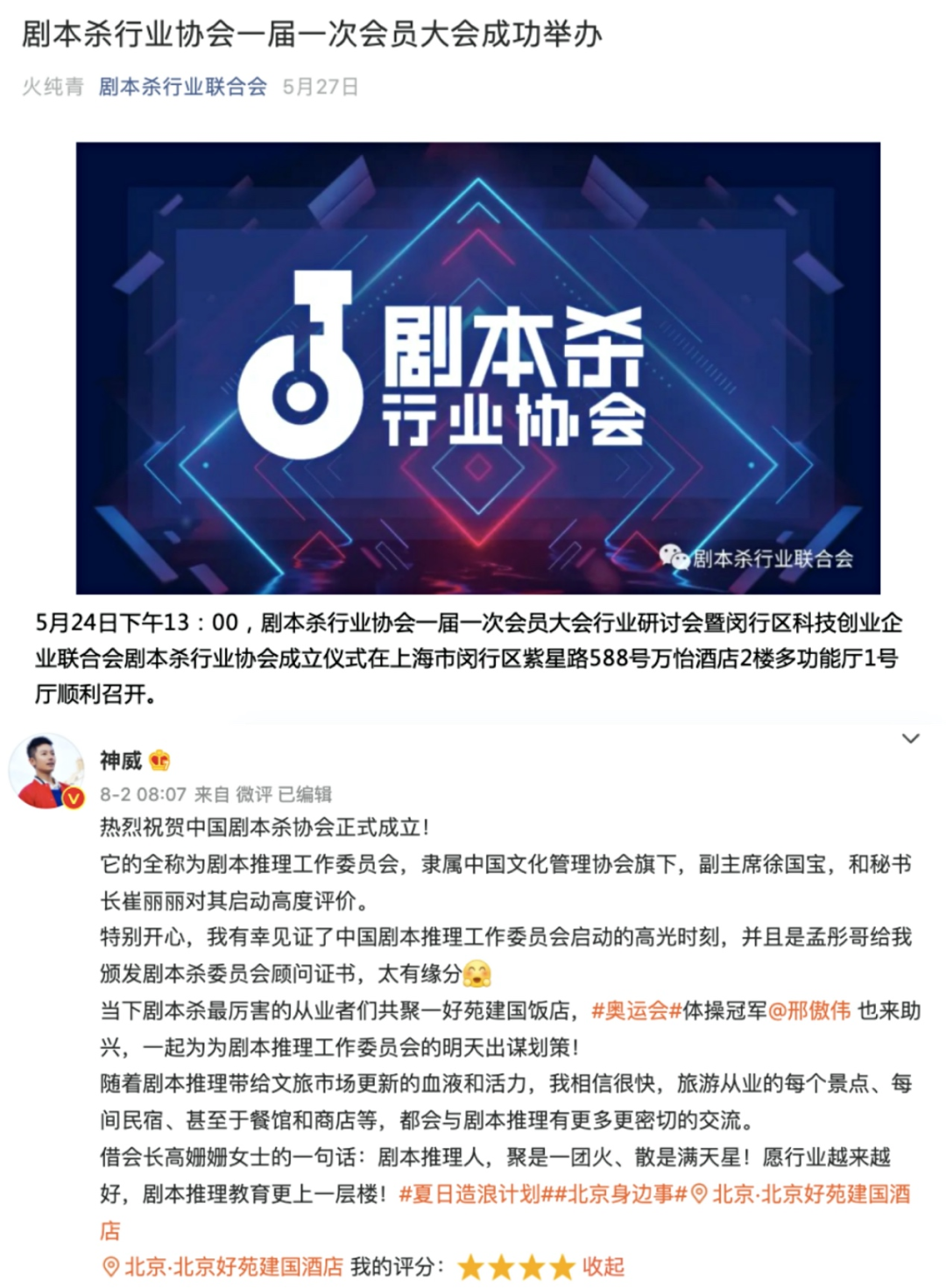 不过在一些业内人士看来,现在这一阶段成立的协会,很多可能还没有正式的官方授权,更多是剧本杀从业者的自发行为。