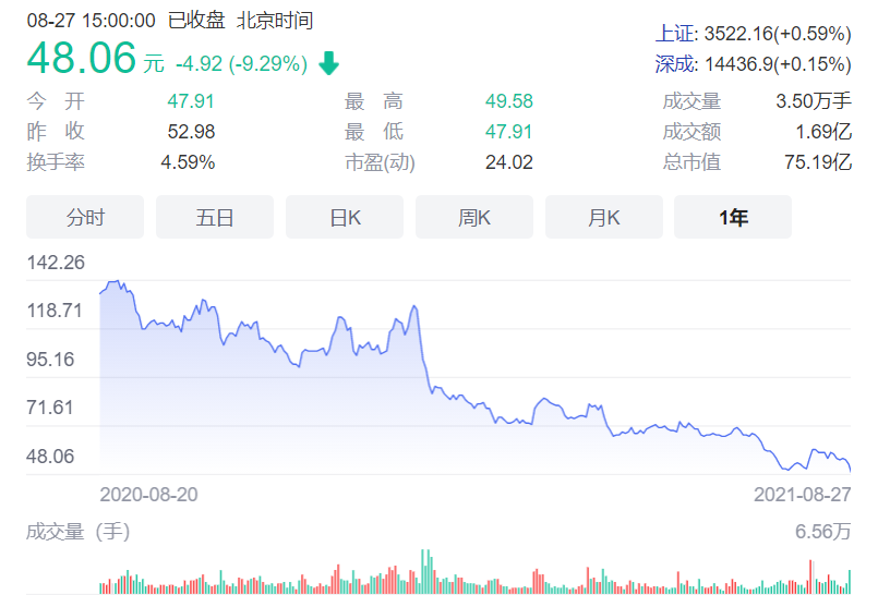 除了财报的不理想,小熊的大盘走势近一年来一直是肉眼可见的低迷状态。2019年挂牌上市后市值飙涨4倍、超220亿元的风光持续不长,从最高点的165.9/股跌至最低点的49.24/股,即使相比较于8月27日的收盘价48.06/股,跌幅超60%,市值蒸发近100亿元。