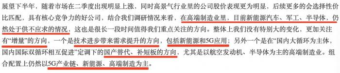 整体上我们没有特别大的变化,更加关注有“增量”的方向,一个是技术进步带来需求提升的方向,包括新能源和5G应用;另外一个是在“国内大循环为主体,国内国际双循环相互促进”定调下的国产的替代、补短板的方向,尤其是以航空发动机、半导体为主的高端制造业。组合配置上仍然以5G产业链、新能源、高端制造为主。