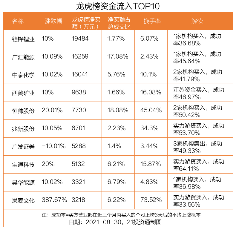 38只上榜的龙虎榜个股中,22只个股被净买入,16只个股被净卖出。其中,资金净买入最多的是赣锋锂业,达1.95亿元,占总成交金额的1.77%。赣锋锂业当日收盘上涨10%,换手率为6.07%。