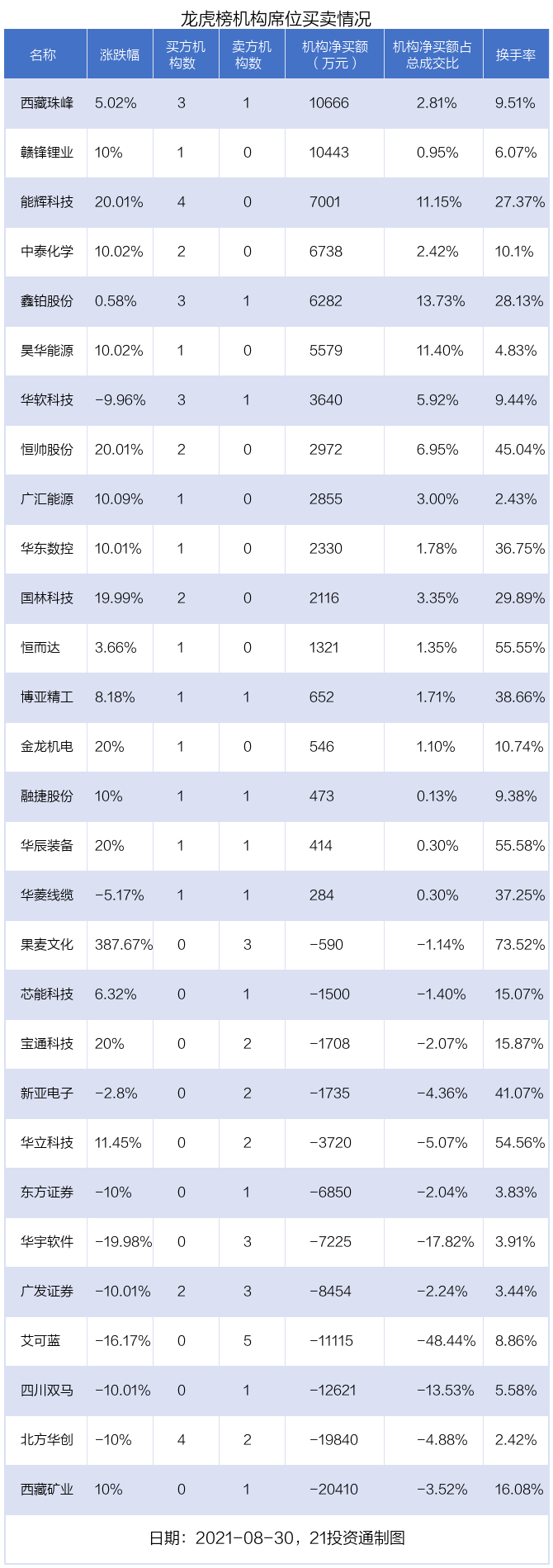 8月30日,29只个股龙虎榜出现了机构的身影,机构合计净卖出3.15亿元。具体来看,机构净买入17股,净卖出12股。