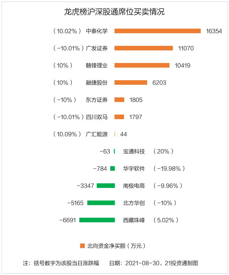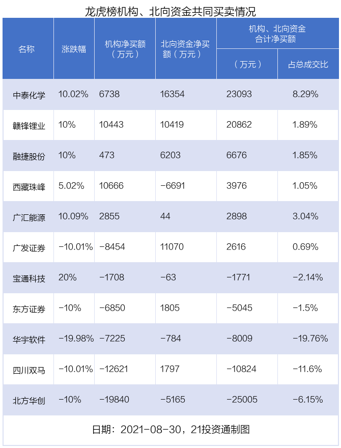值得注意的是,机构和北向资金共同净买入了中泰化学、赣锋锂业、融捷股份、广汇能源等4股;共同净卖出了宝通科技、华宇软件、北方华创等3股;在广发证券,东方证券,四川双马,西藏珠峰上出现分歧。