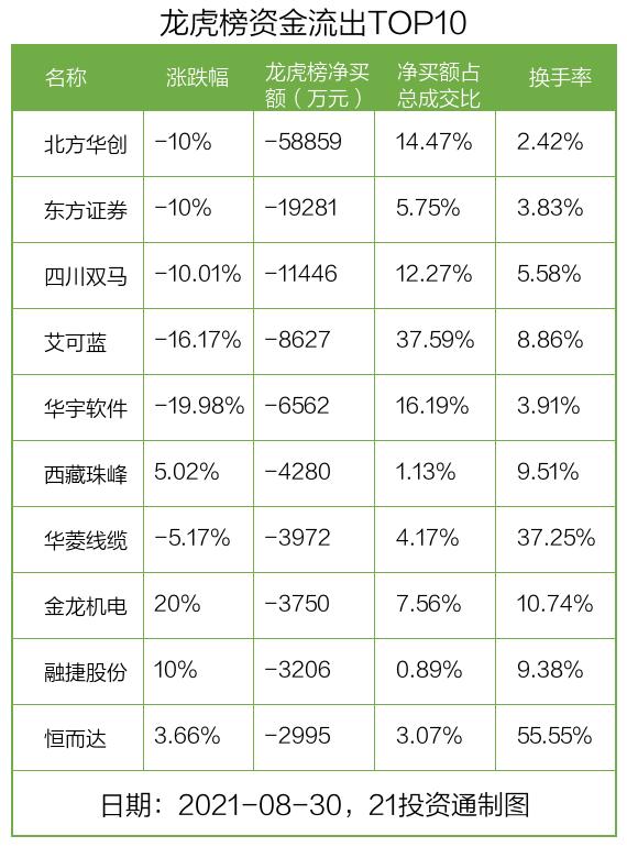 而龙虎榜中资金净流出最多的是半导体设备龙头北方华创(002371.SZ),被净卖出为5.89亿元,占总成交金额的14.47%。当日北方华创午后闪崩跌停,报351.01元/股,换手率为2.42%。消息面上,北方华创8月30日将发布半年报。