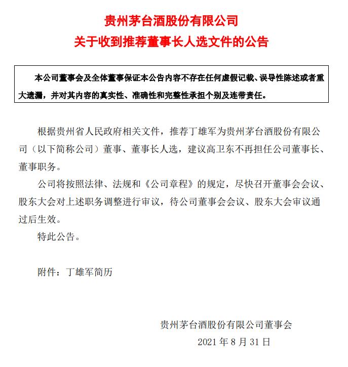 8月30日,贵州茅台公告,根据贵州省人民政府相关文件,推荐丁雄军为公司董事、董事长人选,建议高卫东不再担任公司董事长、董事职务。公司将尽快召开董事会会议、股东大会对上述职务调整进行审议,待公司董事会会议、股东大会审议通过后生效。