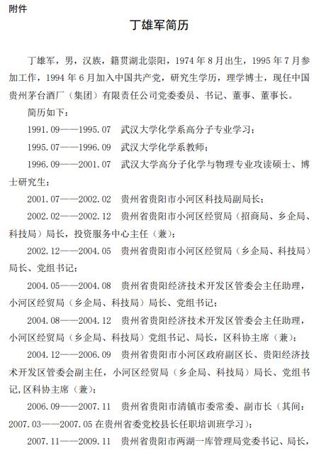 贵州茅台:推荐丁雄军为公司董事、董事长人选,建议高卫东不再担任董事长职务