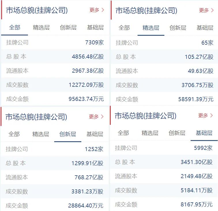 新三板挂牌公司总计7309家(精选层65家,创新层1252家,基础层5992家),总股本4856.48亿股,流通股本2967.38亿股。