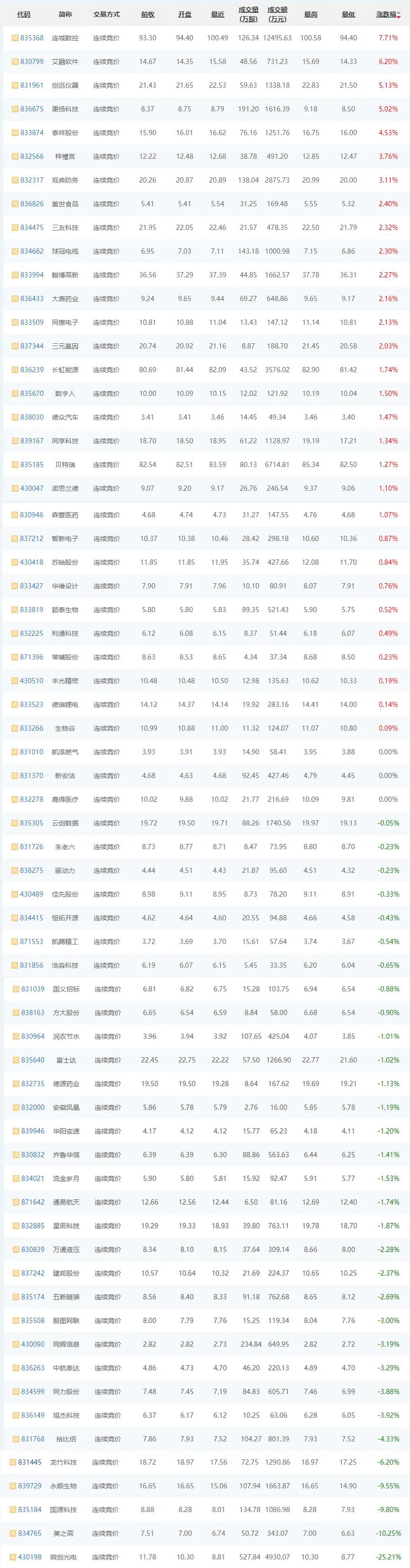 截至8月30日收盘,今日成交金额为9.56亿元,精选层成交金额为5.86亿元,创新层成交金额为2.89亿元,基础层成交金额为0.82亿元;今日成交股数为12272.09万股,精选层成交股数为3706.75万股,创新层成交股数为3381.23万股,基础层成交股数为5184.11万股。