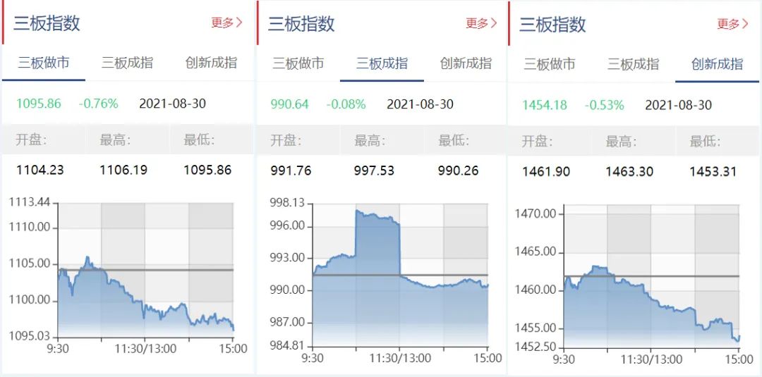 截至8月30日收盘,三板做市报1095.86点,下跌0.76%;三板成指报990.64点,下跌0.08%;三板创新报1454.18点,下跌0.53%。