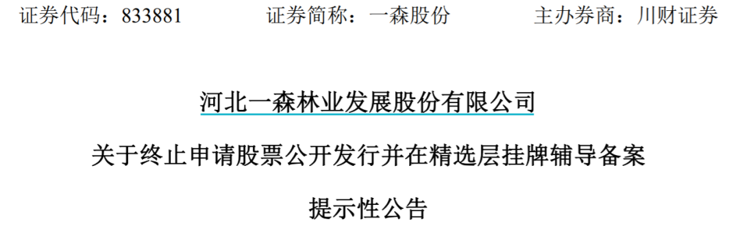 8月30日,一森股份(833881)公告称,终止申请精选层挂牌辅导。
