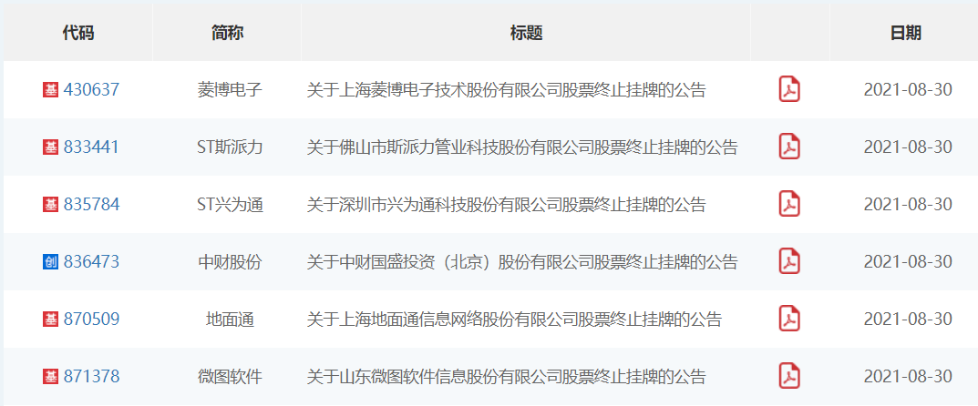 8月30日,新三板创新层公司中财股份(836473)及基础层公司菱博电子(430637)、ST斯派力(833441)、ST兴为通(835784)、地面通(870509)、微图软件(871378)终止挂牌。