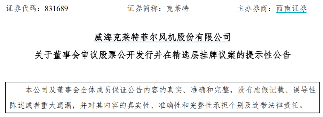 8月30日,新三板公司克莱特(831689)于近日发布了董事会审议公开发行并在精选层挂牌议案的提示性公告。