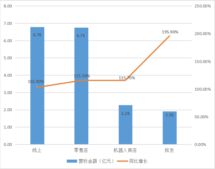 分业务来看,多渠道实现收入增长。2021H1公司零售店/机器人商店/线上/批发分别实现营收6.753/2.276/6.783/1.915亿元,分别同比增长115.5%/115.7%/102.9%/195.9%,占比分别为38.10%/12.83%/38.27%/10.80%。