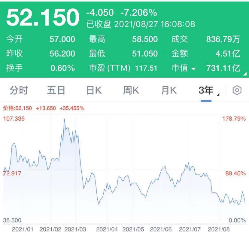 但是在资本市场上,股民却在用脚投票。公司由上市发行价38港元到107.6港元的最高峰仅用两月,市值高达1500多亿港元,在此以后便开始走跌。截至8月27日收盘,泡泡玛特股价报52.150港元,市值731.11亿港元,较巅峰时期的1500多亿港元呈腰斩态势。
