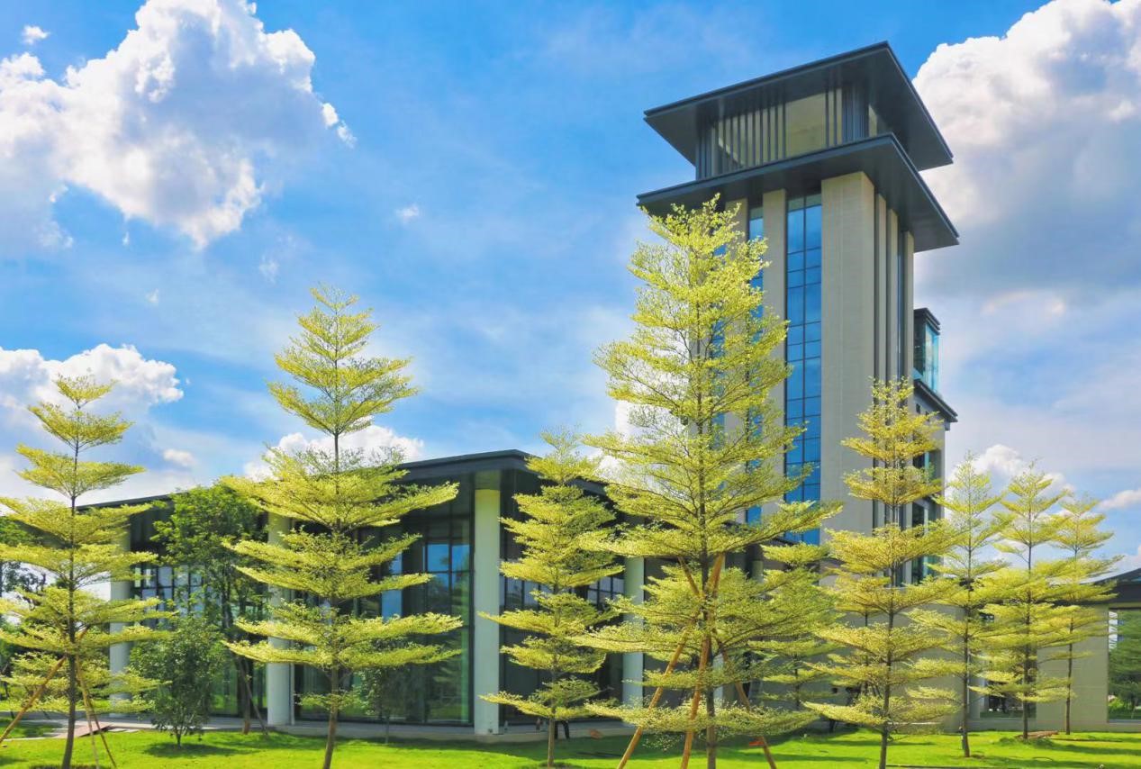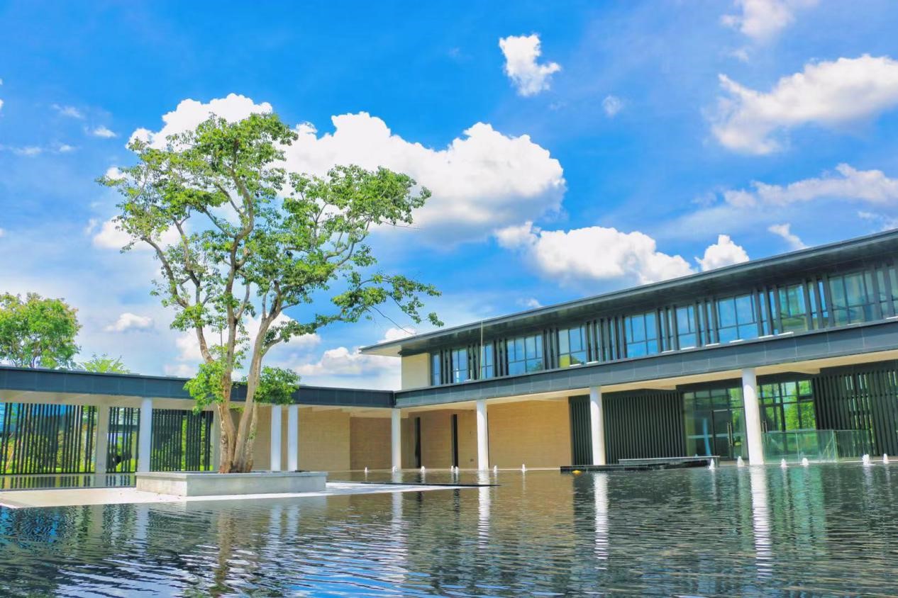 沥滘净水厂(三期)以环保、绿色、亲民、集约的设计思路,充分利用周边海珠国家湿地公园和瀛洲生态公园的优美景观资源优势,发扬现代岭南建筑的特点,尽显建筑特有的地域性风格。建筑设计以集约为原则,污水处理中心采用全地埋式设计,以最小的用地、最流畅的工业建筑流程,噪音与废气排放最小化的设计原则,在满足建筑空间与用地尺度配置适宜的前提下与自然景观融合,使整个污水厂围绕于绿色植被和清涓细流之中。