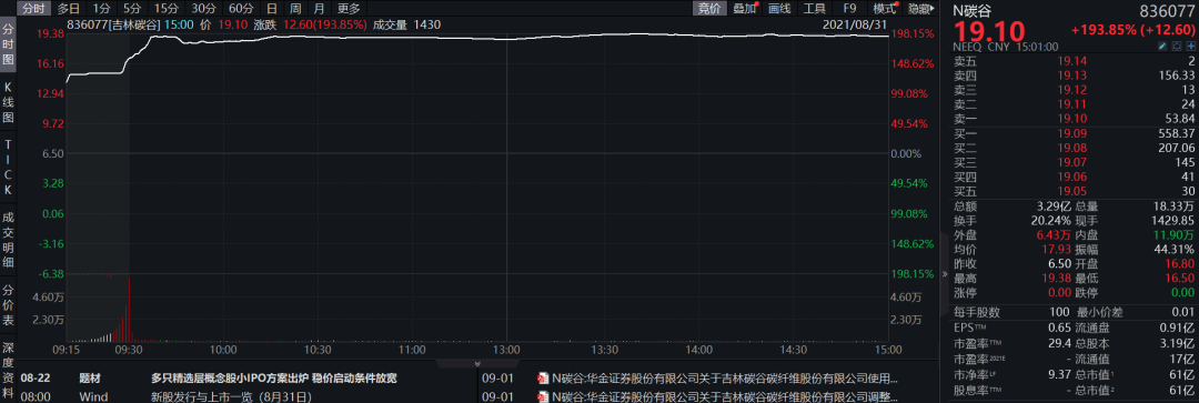 最终,吉林碳谷报收19.10元/股,当日涨幅193.85%,刷新精选层首日涨幅记录。吉林碳谷单日成交额为3.29亿元,单日换手率20.24%。