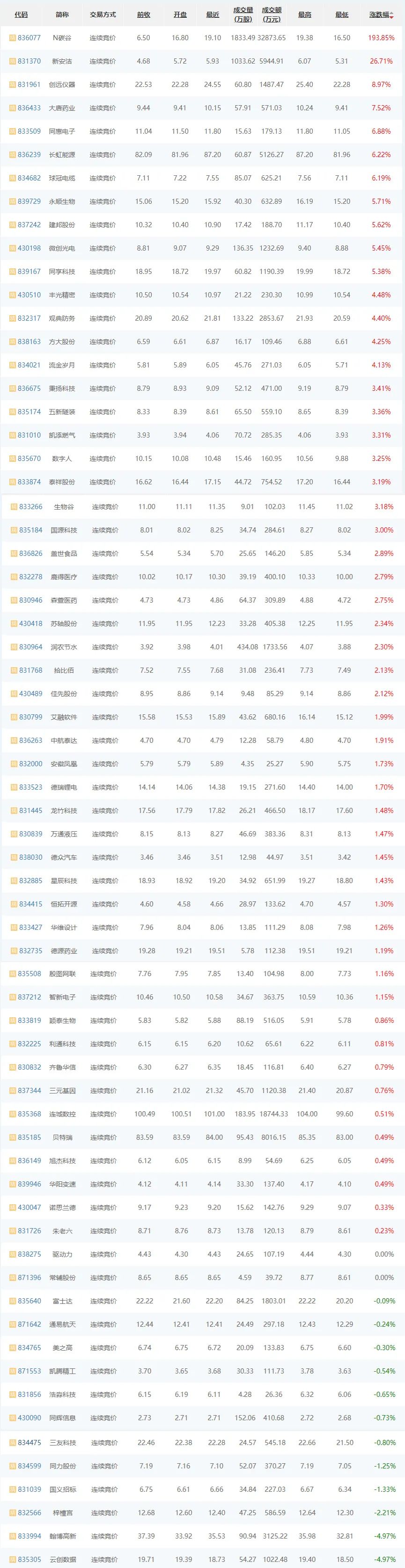 8月31日,精选层普涨,52家企业上涨,2家平盘,12家下跌。其中,吉林碳谷(836077)挂牌首日涨幅居首,上涨193.85%;新安街(831370)居次上涨26.71%;云创数据(835305)跌幅居首,下跌4.97%;翰博高新(833994)居次下跌4.97%;驱动力(838275)、常辅股份(871396)平盘。