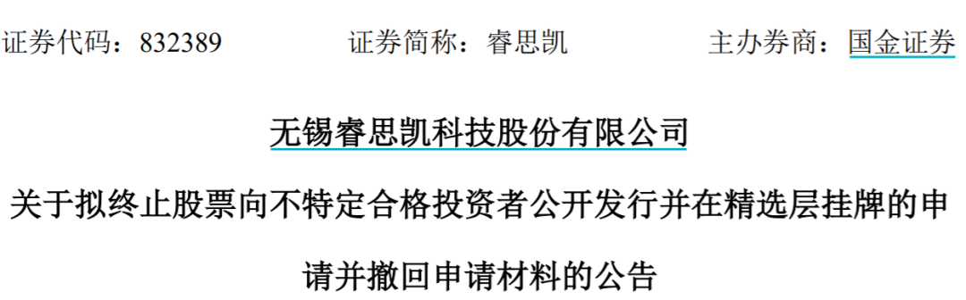 睿思凯表示,基于对目前现状和未来战略规划的考虑,并对资本市场路径重新研判规划,经认真研究和审慎决定,拟终止股票向不特定合格投资者公开发行并在精选层挂牌的申请并撤回相关申请材料。