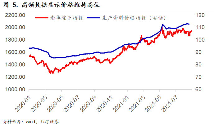 价格方面,虽然原材料购进价格指数下降了1.6个百分点,但从市场数据上可以看到,8月国内大宗商品整体依旧较为强势,商务部公布的生产资料价格指数相比于7月末继续上行,而南华综合指数整体也在高位震荡。