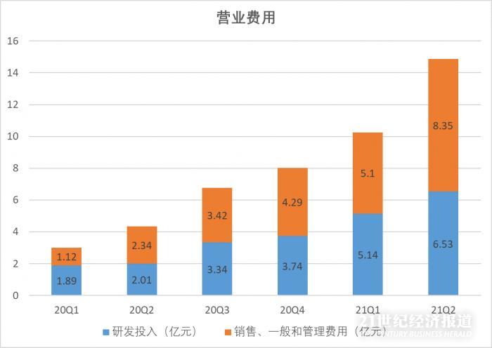 除了研发成本的上升,销售、一般和管理费用则首次大幅超过研发费用,2021年二季度达到了8.35亿元,整个2021年上半年则为13.45亿元,同比增加287.3%。据财报显示,这部分费用增加主要是由于销售网络的扩大以及租金支出的增加。