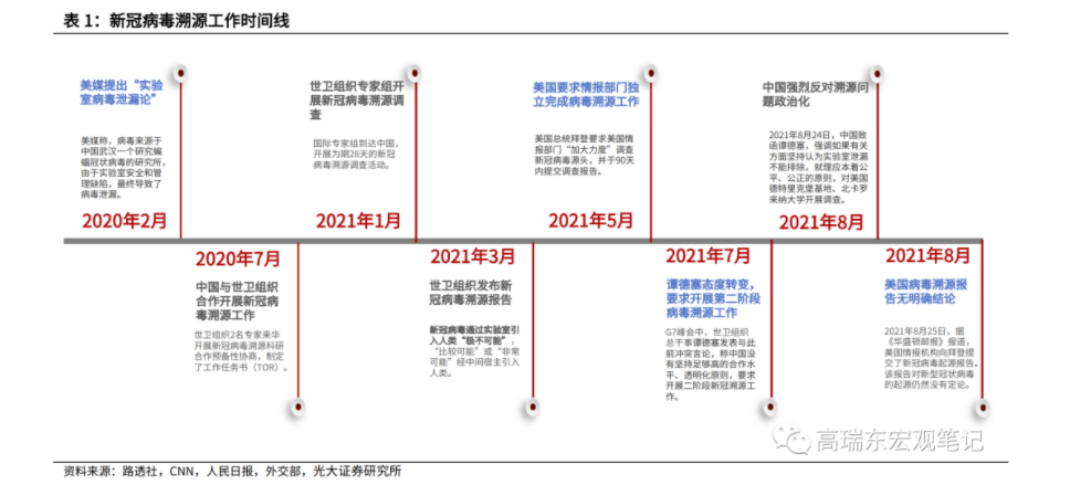 美国时间8月27日,美国情报处最终公布90天病毒溯源调查报告摘要,美国无视世卫组织的科学调查结果,将本次病毒溯源调查无果的责任归咎于中国。所谓的病毒溯源调查已经远远脱离科学性,沦为拜登政府对内推脱抗疫责任、对外遏制中国的政治工具。拜登下一步计划联合盟友,推动世卫组织对中国展开第二轮病毒溯源报告,但我们认为面临较大阻力.