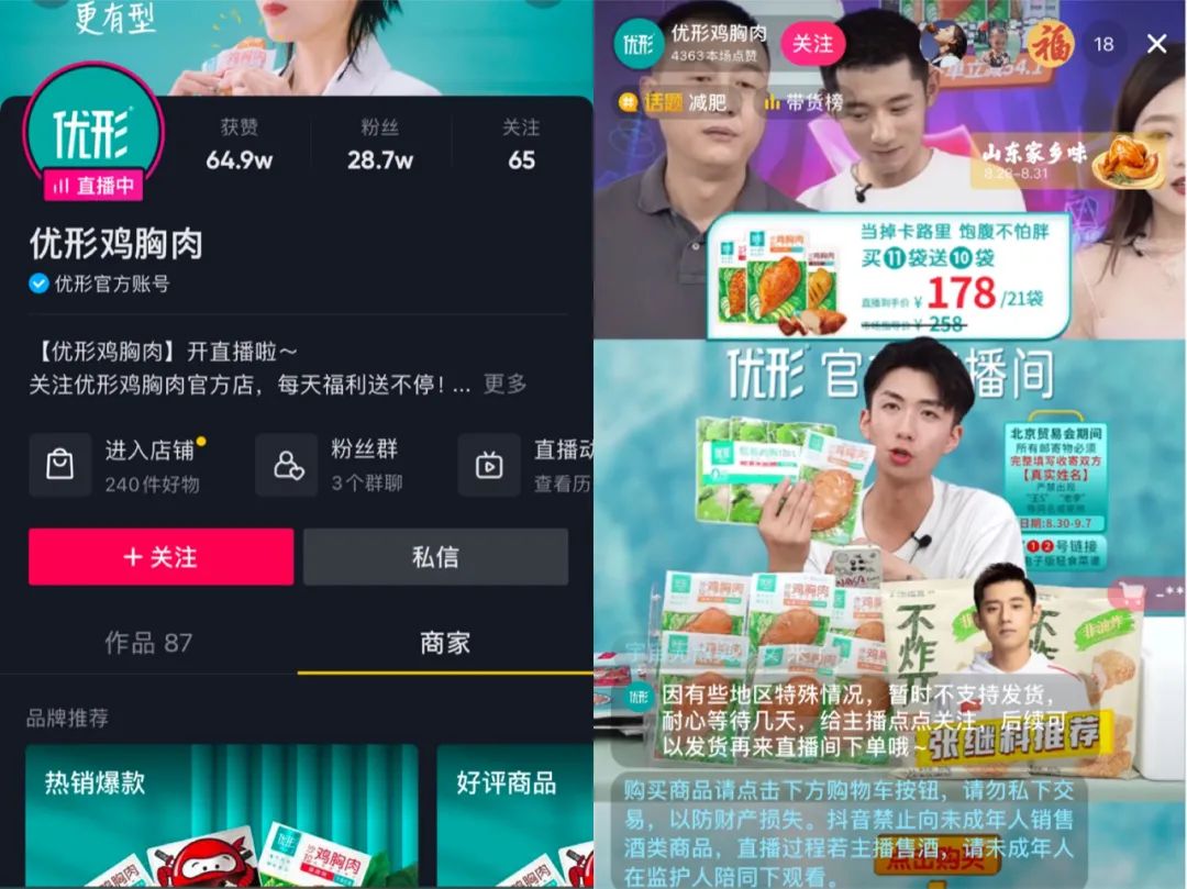 重点发力直播电商的优形,虽然抖音账号粉丝不足30万,但其流量转化效率极高,超过10小时的超长直播,搭配大件促销装的销售策略,让优形的客单价达到了125元,远超同类直播间。另据蝉妈妈平台数据显示,“优形鸡胸肉”抖音账号直播的30天内,共上架了30件产品,总销量为6.1w,场均销售额34.6w,月销过千万。