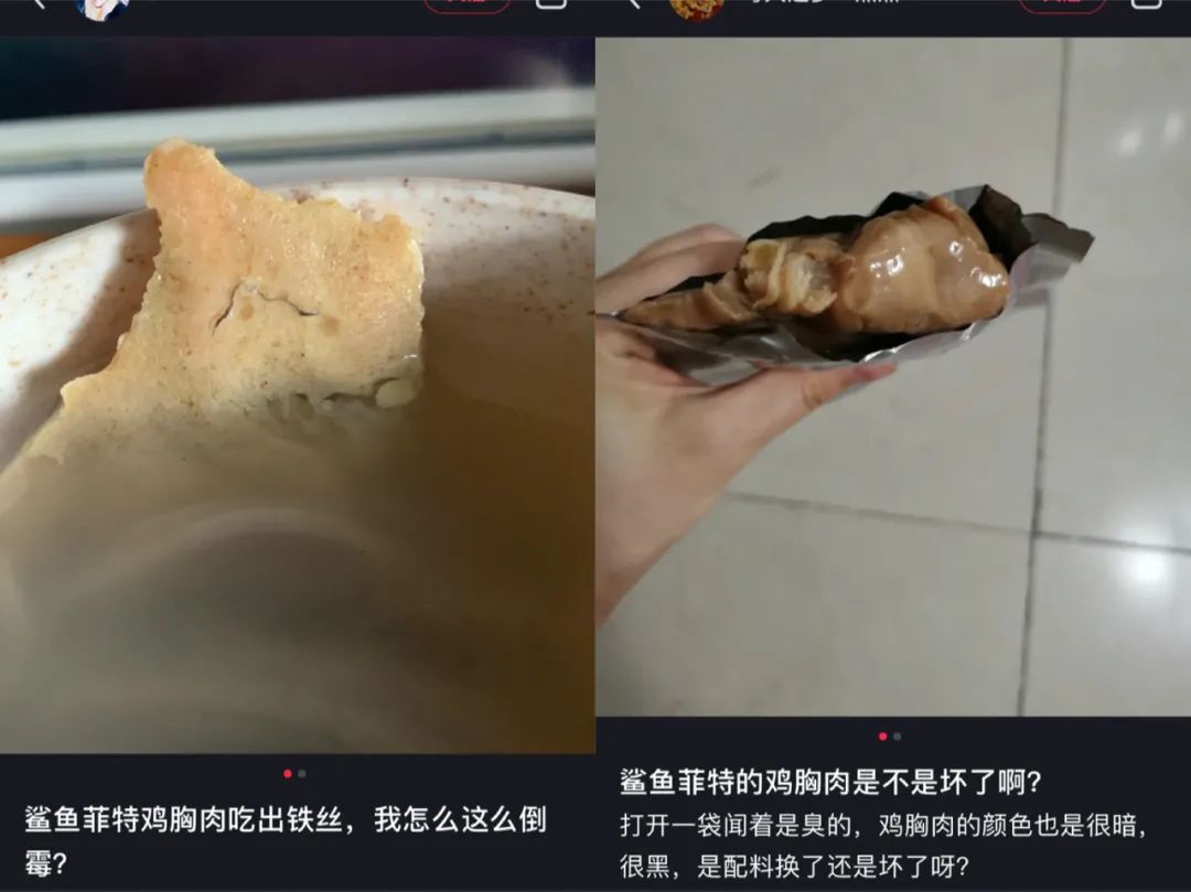 惊蛰研究所在知乎、小红书上搜索鲨鱼菲特时,就发现不少用户反馈在即食鸡胸肉中吃出了异物,或是商品到货后发现已经变质的情况,甚至有用户反馈吃了鲨鱼菲特的产品后“中毒”进了医院。