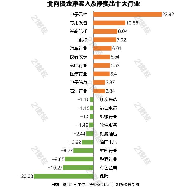 北向资金减持了19个行业,其中保险最多,净卖出金额达20.03亿元,其次是有色金属行业,净卖出10.27亿元。