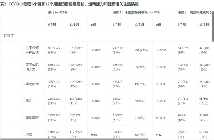 研究发现,仍然出现至少一种症状的患者比例从6个月时的68%(831/1227)下降到12个月时的49%(620/1272)。无论患者住院时经历的新冠症状严重程度如何,出院后症状都随时间延长呈现减少趋势。其中,患疲劳或肌肉无力是最常见的症状,患该后遗症的患者在6个月时占比52%,在12个月时占20%。患睡眠困难症状的患者在6个月时占27%,在12个月时占17%;患脱发、嗅觉障碍的患者比例也有不同程度的下降。患心悸、关节疼痛等的比例没有明显变化。