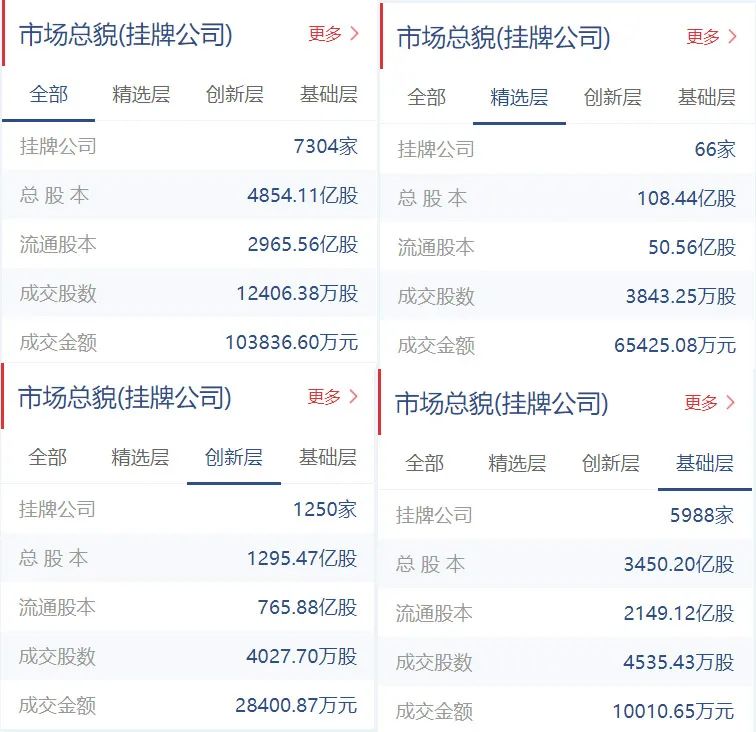 新三板挂牌公司总计7304家(精选层66家,创新层1250家,基础层5988家),总股本4854.11亿股,流通股本2965.66亿股。
