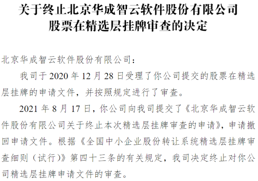 公告显示,全国股转公司于2020年12月28日受理了华成智云提交的股票在精选层挂牌的申请文件,并按照规定进行了审查。2021年8月17日,华成智云向全国股转公司提交了《北京华成智云软件股份有限公司关于终止本次精选层挂牌审查的申请》,申请撤回申请文件。
