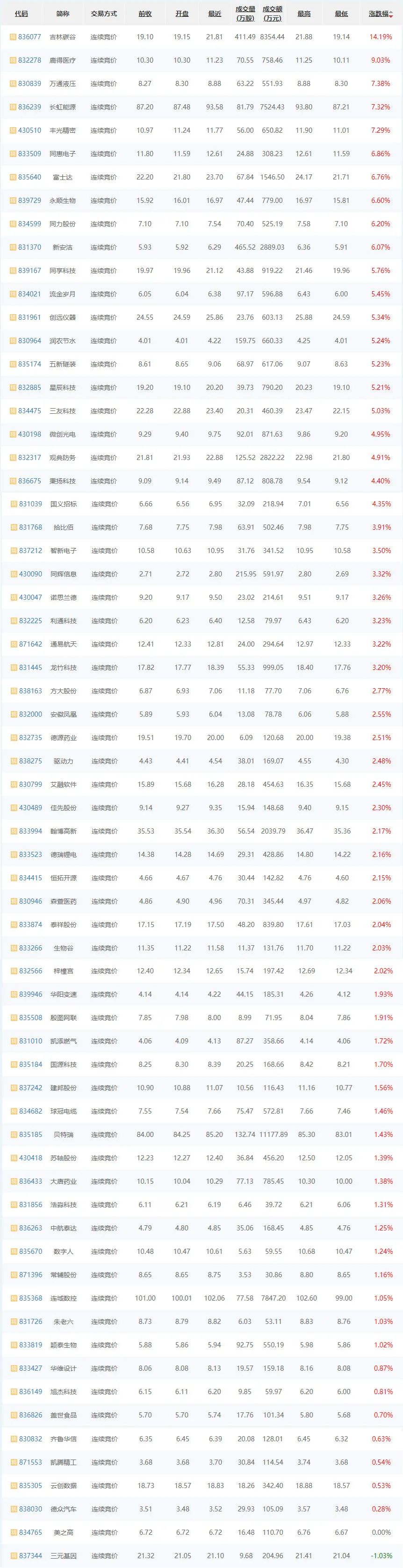 截至9月1日收盘,今日成交金额为10.38亿元,精选层成交金额为6.54亿元,创新层成交金额为2.84亿元,基础层成交金额为1.00亿元;今日成交股数为12406.38万股,精选层成交股数为3843.25万股,创新层成交股数为4027.70万股,基础层成交股数为10010.65万股。